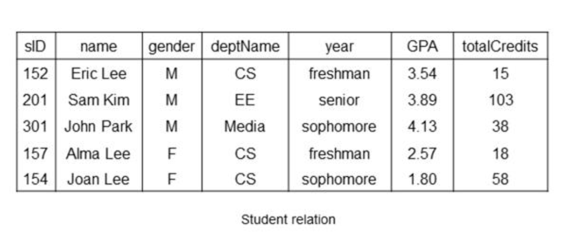 학생이라는 데이터를 표현하기 위해서는 Relation으로 표현한다. (다른 말로하면 table)