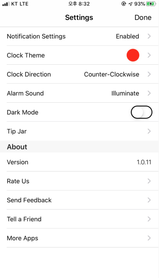 또한 설정 화면을 보면 시계의 테마를 빨간색말고 노란색, 파란색 등 여러 색깔로 바꿀 수 있고 시계방향으로 할건지 반시계방향으로 할 것인지, 그리고 알람 소리는 어떤 것으로 할 것인지 다크모드 지원 등 여러 설정들이 있습니다.