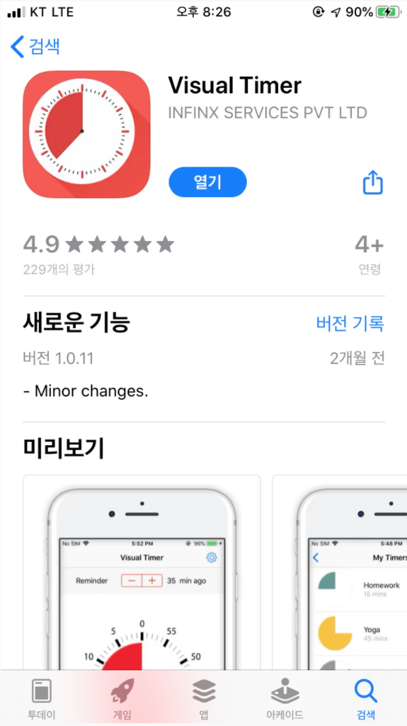 플레이스토어 "Visual Timer" 앱 앱스토어와 플레이스토어에 각각 "Visual Timer"라는 이름의 앱이 있습니다. 제 메인 스마트폰이 아이폰이라서 아이폰을 위주로 해서 설명드리겠습니다.