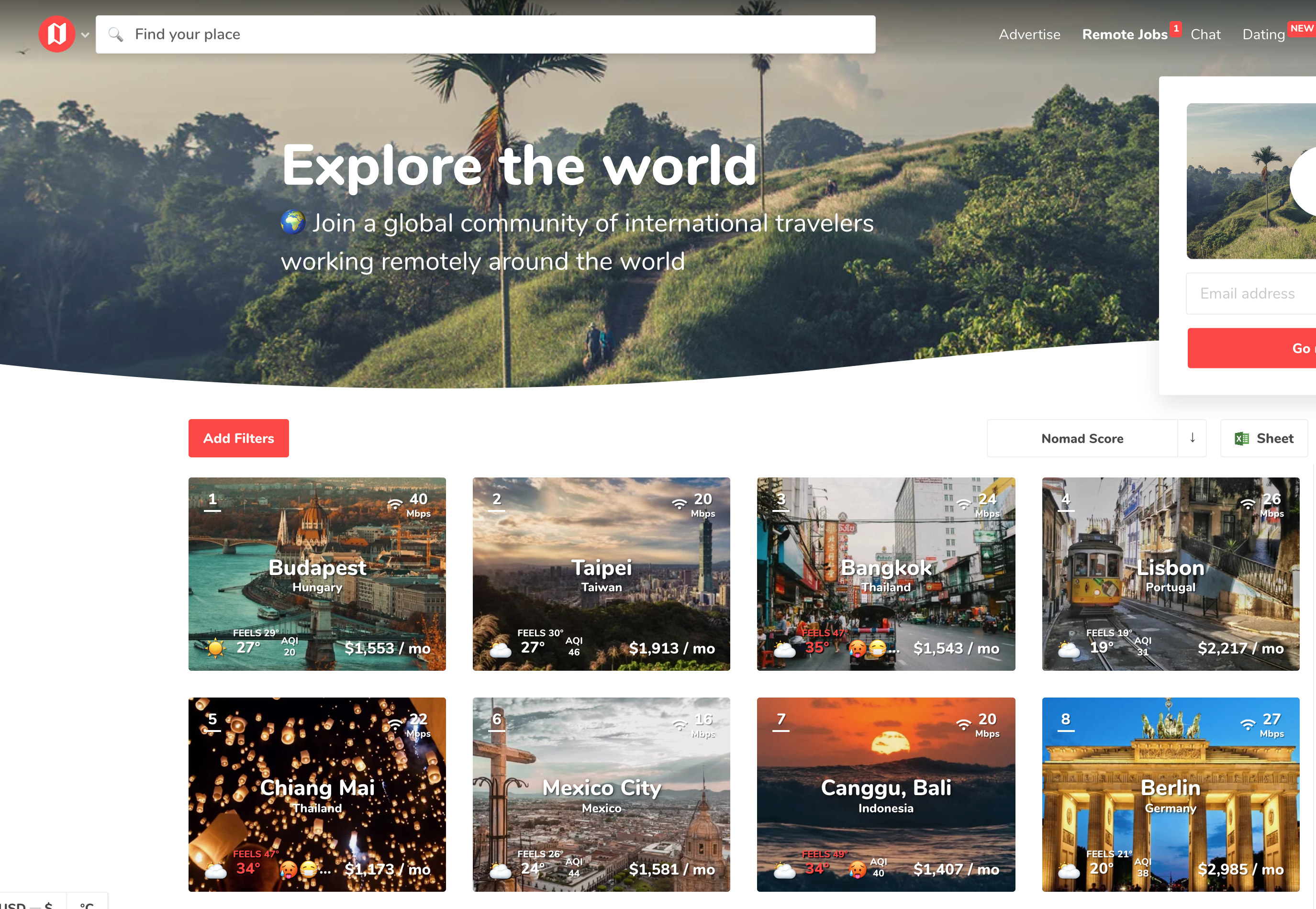 노마드리스트 메인페이지 노마드리스트라는 디지털노마드로 지내기 좋은 도시들을 필터링 및 정렬을 해서 보여주는 사이트가 있습니다. (노마드리스트는 유명한 디지털노마드 개발자가 1개월 1스타트업만들기 프로젝트로 만든 것으로 유명합니다.)